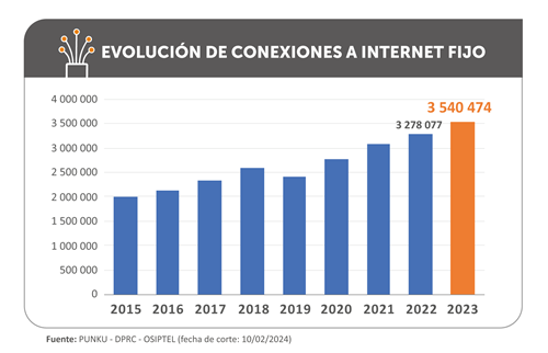 El mayor despliegue de fibra óptica resultó fundamental para que el número de conexiones al servicio de internet fijo continuara creciendo. A diciembre de 2023 se totalizan 3 540 474 conexiones de internet fijo, lo que representó un avance de 8 % respecto al mismo periodo del año previo.