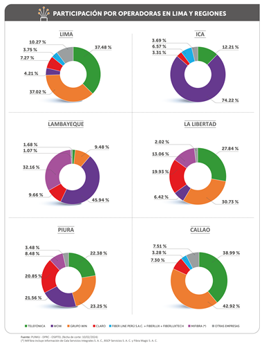 A nivel regional, se evidencia un retroceso en la participación de Telefónica, lo cual ha sido aprovechado principalmente por Wow y Win que han consolidado su presencia fuera de la capital. Por ejemplo, Wow lidera la participación en Ica con 74.22 %, seguida por Telefónica (12.21 %) y Fiberlux, Fiberlux Tech y Fiberline Perú (6.57 %). Wow también es líder en Lambayeque (45.94 %), seguida de MiFibra (32.16 %), seguida de Claro (9.66 %) y Grupo Win (9,48 %). En tanto, en el departamento de La Libertad, Grupo Win tiene mayor participación (30.73 %), seguida de cerca por Telefónica (27.84 %).