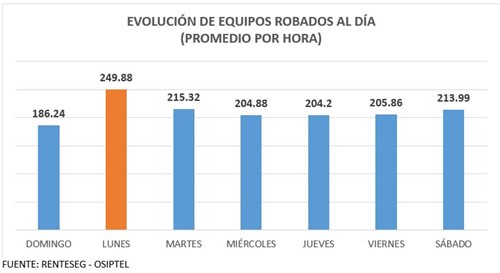 La mayor cantidad de reportes de equipos móviles robados por hora se realizan los días lunes (249 en promedio), seguido del martes (215) y del sábado (213), según los datos del Registro Nacional de Equipos Terminales Móviles para la Seguridad (RENTESEG) correspondientes al primer semestre de 2023, analizados por el Organismo Supervisor de Inversión Privada en Telecomunicaciones (OSIPTEL).