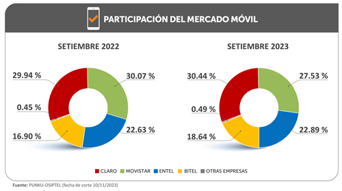 En dicho periodo, Claro se mantiene como líder del mercado móvil con una participación de 30.44 %, y con una diferencia de casi tres puntos porcentuales por encima de Movistar, la cual registró el 27.53 % de participación. Entel y Bitel cierran el trimestre con una participación de 22.89 % y 18.64 %, respectivamente.