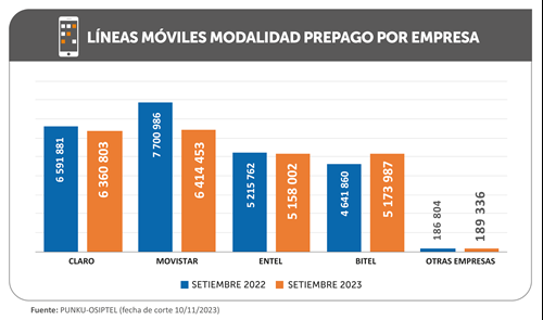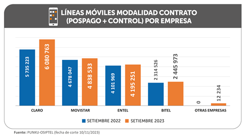 De acuerdo a la información publicada en el portal PUNKU (https://punku.osiptel.gob.pe/) del OSIPTEL, este crecimiento es resultado del avance en la cantidad de líneas móviles de la modalidad contrato de las principales empresas operadoras. Claro reportó 6.02 % más líneas que setiembre de 2022. En tanto, las líneas de Bitel en esta modalidad crecieron en 5.68 %; las de Movistar, en 3.43 %; y las de Entel, en 2.27 % en el mismo periodo.