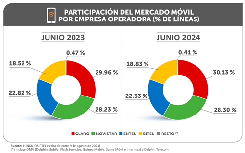 De esta manera, a junio de 2024, Claro lideró el mercado móvil con 12.63 millones de líneas móviles (30.13 % de participación de mercado); seguida por Telefónica con 11.86 millones de líneas (28.30 %). A continuación, se ubican Entel con 9.36 millones (22.33 %) y Bitel con 7.89 millones (18.83 %).