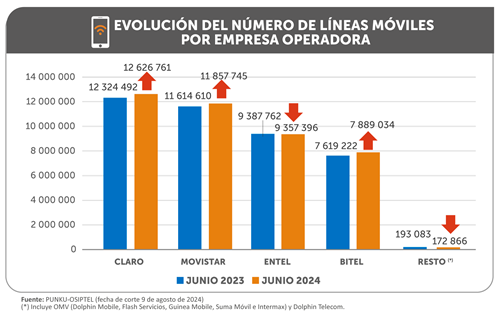 Respecto a junio de 2023, Bitel, Claro y Movistar registraron incrementos en el número de líneas móviles por 3.54 %, 2.45 % y 2.09 %, respectivamente, mientras que Entel registró una reducción de 0.32%, al igual que el resto de operadoras móviles (-10.47 %).