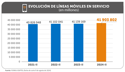 Al cierre del primer semestre del presente año, el Perú registró un total de 41.9 millones de líneas móviles en servicio, lo que representa un incremento de 1.86 % respecto a las cifras reportadas en junio de 2023, informó el Organismo Supervisor de Inversión Privada en Telecomunicaciones (OSIPTEL).