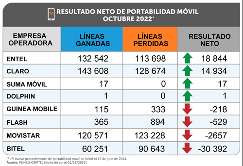 Entel arrebató el primer lugar a Claro entre las empresas operadoras que obtuvieron un saldo neto (la diferencia entre líneas ganadas y perdidas) positivo, al alcanzar las 18 844 líneas móviles netas portadas en octubre, seguido por Claro con 14 934, Suma Móvil con 17 y Dolphin con 1. En tanto, Bitel (-30 392), Movistar (-2657), Flash (-529) y Guinea Mobile (-218) tuvieron un saldo neto negativo.