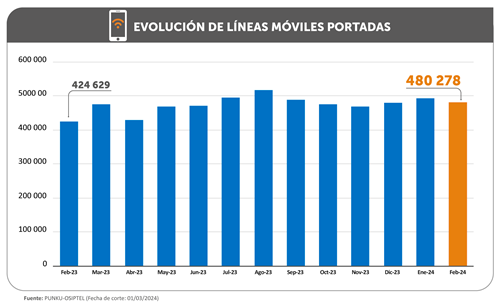 La portabilidad numérica sigue consolidándose como uno de los principales mecanismos para impulsar la competencia en el mercado móvil y, al cierre de febrero de 2024, un total de 480 278 líneas cambiaron de empresa operadora a nivel nacional, 13.11 % más a lo registrado en el mismo mes del año anterior, informó el Organismo Supervisor de Inversión Privada en Telecomunicaciones (OSIPTEL).