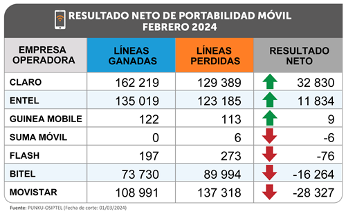 En tanto, las empresas operadoras Suma Móvil, Flash, Bitel y Movistar, registraron resultados netos negativos de 6, 76, 16 264 y 28 327 líneas, respectivamente.