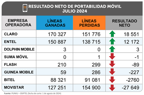 La intensa competencia registrada en julio determinó que Claro y Entel consiguieran un saldo neto (la diferencia entre líneas ganadas y perdidas) positivo. Así, Claro fue la empresa que mayor posición neta registró con 18 551 líneas netas portadas, seguida por Entel con 12 172, líneas netas portadas.