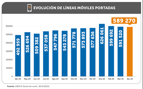 Un total de 589 270 líneas móviles cambiaron de empresa operadora mediante el mecanismo de portabilidad numérica, durante abril de 2025, lo que representó un crecimiento de 19.54 % frente a lo registrado en el mismo mes de 2024 (492 959), informó el Organismo Supervisor de Inversión Privada en Telecomunicaciones (OSIPTEL).