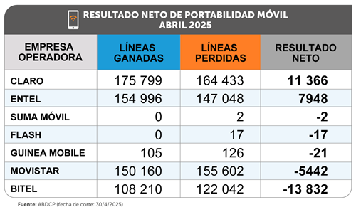 De acuerdo a la información proporcionada por el Administrador de Base de Datos de Portabilidad (ABDP) al OSIPTEL, en abril, Claro consiguió el mejor resultado neto positivo (11 366 líneas), es decir ganó más líneas de las que perdió, seguido de Entel que obtuvo 7948 líneas de saldo neto positivo.