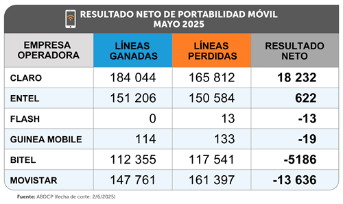 En tanto, las operadoras Movistar, Bitel, Guinea Mobile y Flash obtuvieron un saldo negativo como resultado del mayor número de líneas móviles perdidas. A consecuencia del ejercicio de portabilidad, dichas empresas registraron un resultado negativo de 13 636, 5186, 19 y 13 líneas netas perdidas, cada una, respectivamente.