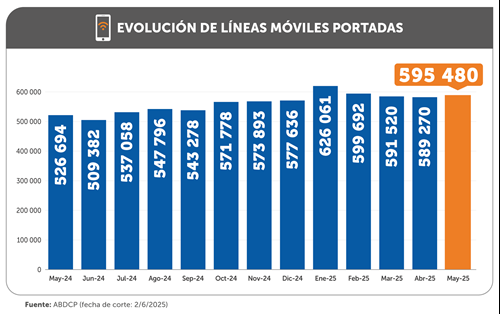 En mayo de este año, la portabilidad numérica en telefonía móvil alcanzó las 595 480 líneas, un 13.1 % más portaciones que lo registrado en mayo de 2024, informó el Organismo Supervisor de la Inversión Privada en Telecomunicaciones (OSIPTEL).