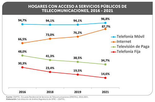 La ERESTEL también reveló que el 97,6 % de los hogares peruanos tiene acceso a por lo menos un servicio de telecomunicación, siendo la telefonía móvil (96,8 %) e internet (87,7 %) los servicios de mayor crecimiento en el país. En contraparte, la demanda de televisión de paga y la telefonía fija continúa descendiendo, al pasar de 48 % a 34,7 % y 30,3 % a 14,6 %, respectivamente, entre 2016 y 2021.