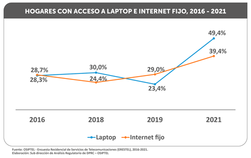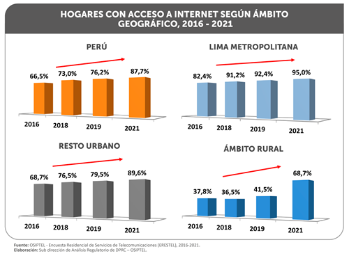 La encuesta del OSIPTEL evidenció que el avance del acceso a internet creció tanto en las conexiones fijas como móviles. Al 2021, el 85,8 % de los hogares peruanos cuenta con internet móvil, mientras que el 39,4 % tiene conexión fija, porcentajes que superan las cifras registradas cinco años atrás, cuando el 64,2 % y el 28,7 % de hogares contaba con conexión móvil y fija, respectivamente.