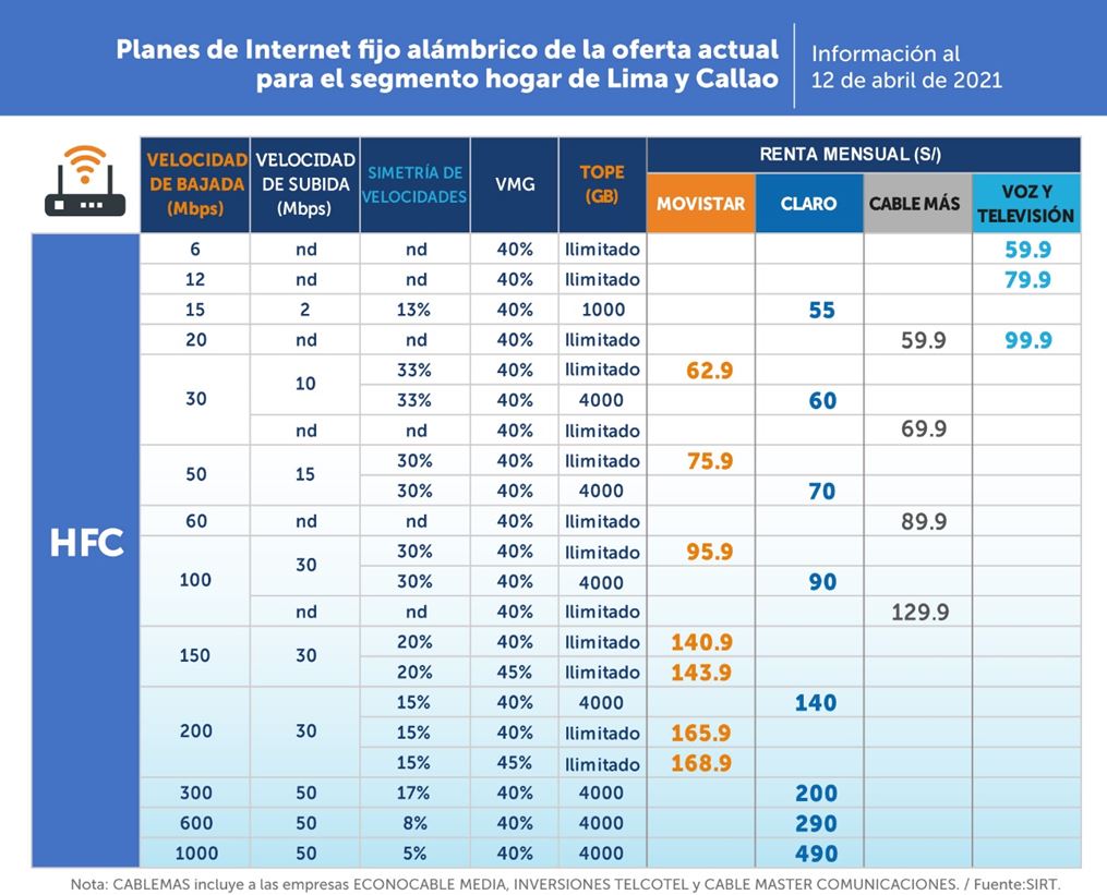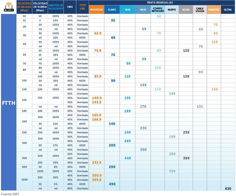 Esta solución posee planes con velocidades de bajada desde 6 Mbps a S/ 59,9 de renta mensual. Sin embargo, por una tarifa de S/55 en otro operador, se pueden obtener velocidades de 15 Mbps, aunque con topes de 1000 GB. En tanto, las características más exigentes de 1000 Mbps pueden alcanzar pagos mensuales de hasta S/ 490. También se observa un avance en la cantidad de opciones que reducen la asimetría de velocidades en su oferta.