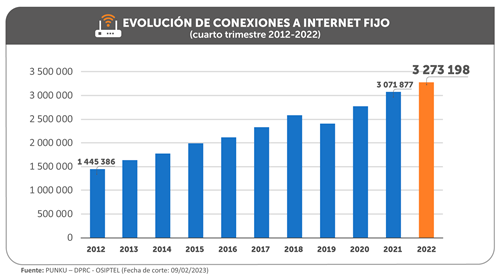 El número de conexiones al servicio de internet fijo continúa en ascenso. Al cuarto trimestre de 2022, se contabilizaron 3 273 198 conexiones, lo que representó un avance de 6.55 % respecto al mismo periodo del año previo, informó el Organismo Supervisor de Inversión Privada en Telecomunicaciones (OSIPTEL).