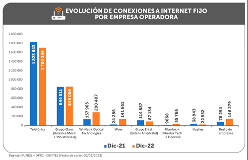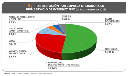 A diciembre de 2022, se ha considerado la información de 71 empresas operadoras que ofrecen servicios de conexión a internet fijo en todo el país. De acuerdo con la información procesada por la Dirección de Políticas Regulatorias y Competencia del OSIPTEL, Telefónica es el principal perdedor a nivel de participación de mercado en los últimos doce meses, reduciendo su participación en 7.42 puntos porcentuales, lo cual ha sido aprovechado por el grupo conformado por Wi-net y Optical Technologies, la empresa Wow, y por el grupo conformado por las empresas Fiberlux, Fiberlux Tech y Fiberline, los cuales han incrementado su participación en 4.38%, 3.54% y 0.78%, respectivamente.