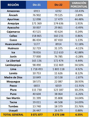 Dieciocho regiones incrementaron las conexiones al servicio de internet fijo a diciembre de 2022. Huancavelica (72.18 %), Apurímac (44.48 %), Ica (42.88 %) y Lambayeque (34.50 %) fueron las regiones que mayor variación porcentual en la cantidad de conexiones presentaron, a diferencia de Pasco (-11.91 %), Amazonas (-10.43 %), Puno (-6.26 %) y Huánuco (-4.11 %), que fueron las que más retrocedieron en la cantidad de conexiones con relación al mismo periodo del año anterior.