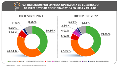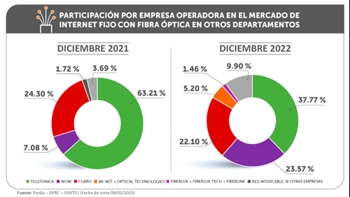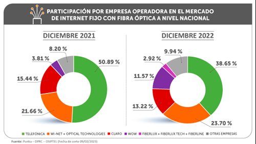 Según la información procesada por la Dirección de Políticas Regulatorias y Competencia (DPRC) del OSIPTEL, al cierre del 2022, Telefónica y Claro redujeron su participación en los últimos doce meses, en 12.24 y 2.21 puntos porcentuales, respectivamente. Mientras que la empresa Wow y el grupo conformado por Wi-net y Optical Technologies, incrementaron su participación en 7.75 y 2.05 puntos porcentuales, respectivamente.