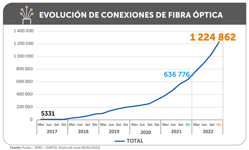 La fibra óptica se consolida. Al cierre de 2022, se reportaron 1 224 862 conexiones de internet fijo con fibra óptica, lo que representó un avance del 92.35 % respecto a similar periodo de 2021, cuando se registraron 636 776 conexiones, informó el Organismo Supervisor de Inversión Privada en Telecomunicaciones (OSIPTEL).