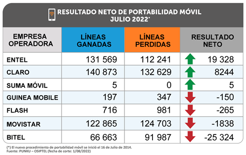 En julio las empresas Entel, Claro y Suma Móvil obtuvieron un saldo neto (la diferencia entre líneas ganadas y perdidas) positivo. Entel lideró el balance positivo de julio con 19 328 líneas móviles netas portadas, seguida de Claro con 8244 y Suma Móvil con 5 líneas móviles netas portadas, respectivamente. En tanto, Bitel (-25 324), Telefónica (-1838), Flash (-265) y Guinea Mobile (-150) tuvieron un saldo neto negativo.