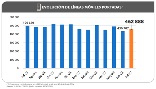 Un total de 462 888 líneas móviles cambiaron de empresa operadora en julio de este año, superando en 6.00 % lo alcanzado en el mes previo (436 707 líneas), no obstante, se evidenció un retroceso de 7.26 % frente a lo reportado en julio de 2021, informó el Organismo Supervisor de Inversión Privada en Telecomunicaciones (OSIPTEL).