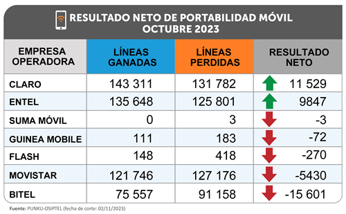 Al igual que en setiembre, los operadores móviles que consiguieron más portaciones netas (es decir, la diferencia entre líneas ganadas y perdidas) positivas mensuales fueron Claro y Entel. La empresa Entel consiguió 9847 líneas netas portadas, mientras que Claro obtuvo 11 529 líneas netas portadas, recuperando así el liderazgo de portaciones netas en octubre.