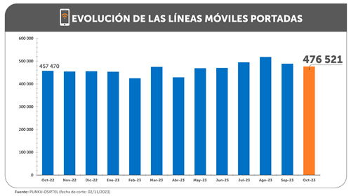 En octubre de este año, la portabilidad numérica en telefonía móvil alcanzó las 476 521 líneas, un 4.2 % más portaciones que lo registrado en el mismo mes del 2022, informó el Organismo Supervisor de la Inversión Privada en Telecomunicaciones (OSIPTEL). Este resultado representa el cuarto mayor registro de portaciones de los últimos doce meses.