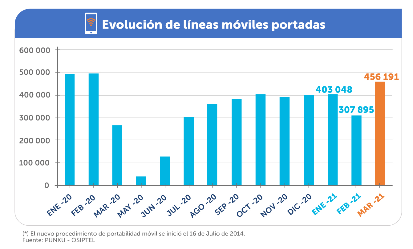 El resultado de marzo de 2021 fue superior en 48,2 % respecto a las 307 895 líneas que cambiaron de operador el mes previo. Además, es la cifra más alta en lo que va del año y un 72,1% mayor que lo registrado en el mismo mes del 2020, tal como grafica PUNKU, el portal a la información de las telecomunicaciones del regulador.