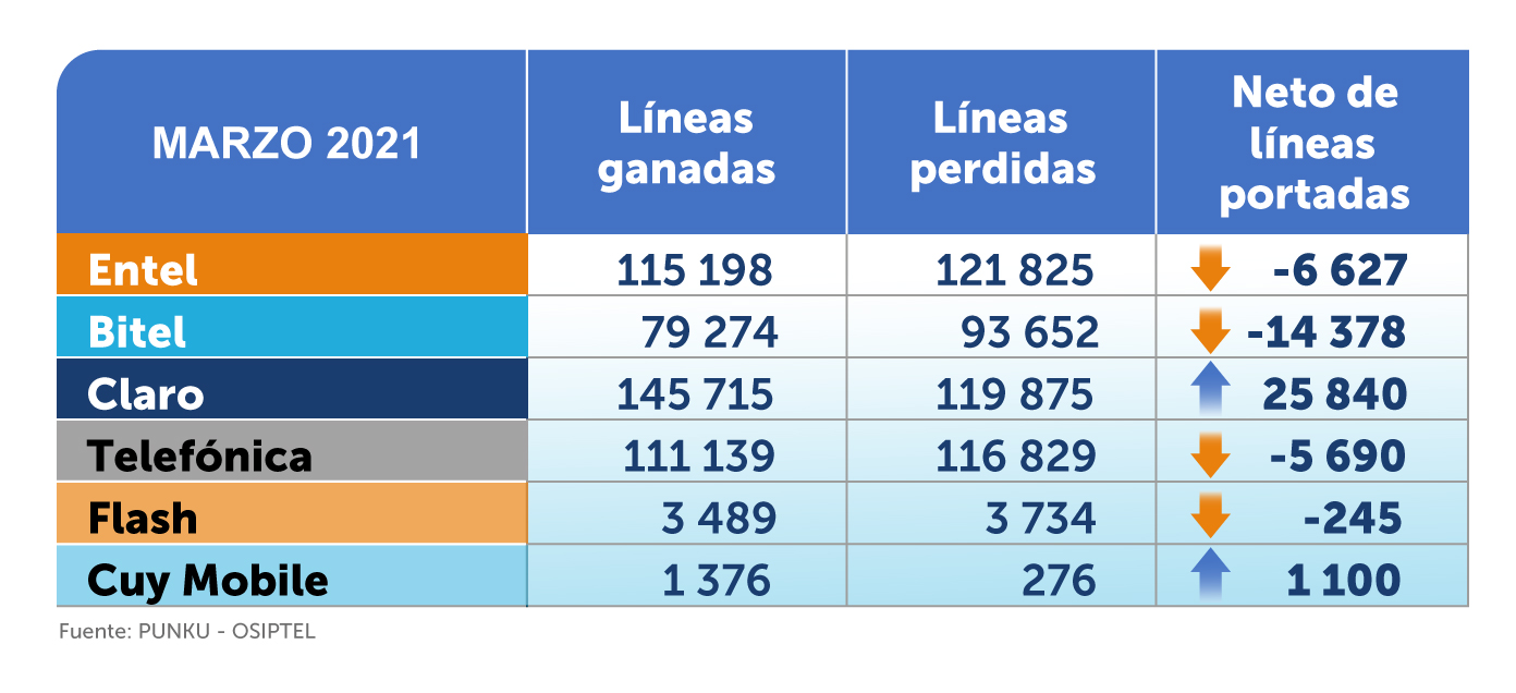 La intensa oferta competitiva en telefonía móvil llevó a que empresas como Claro y Cuy Mobile consiguieran portaciones netas (es decir, la diferencia entre líneas ganadas y perdidas) positivas en el mes marzo con 25 840 y 1100 líneas, respectivamente. Del total de líneas ganadas por Claro, 37% provienen de Entel, 35,9% de Telefónica, 26,3% de Bitel, 0,8% de Flash y 0,1% de Cuy Mobile.