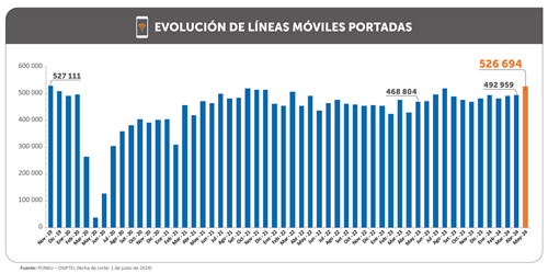 El resultado de mayo de 2024 fue superior en 6.8 % respecto a las 492 959 líneas que cambiaron de operador el mes previo. Además, es la cifra más alta en lo que va del año y un 12.3 % mayor que lo registrado en el mismo mes del 2023, tal como grafica PUNKU (https://punku.osiptel.gob.pe/), el portal a la información de las telecomunicaciones del regulador.