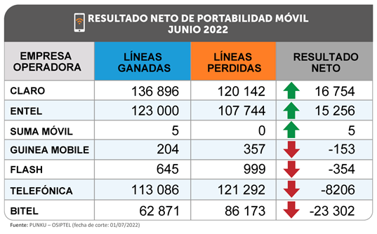 En lo que respecta a líneas ganadas y perdidas por operador móvil, en junio las empresas Claro, Entel y Suma Móvil obtuvieron portaciones netas (la diferencia entre líneas ganadas y perdidas) positivas. Tal como ocurrió en mayo, Claro lideró el balance positivo de junio con 16 754 líneas móviles netas portadas, seguida de Entel con 15 256 y Suma Móvil con 5 líneas móviles netas portadas, respectivamente.