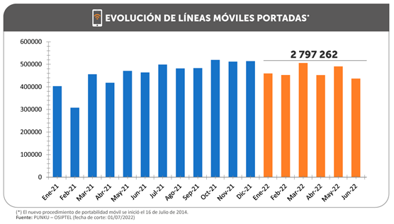 Solo en el mes de junio, 436 707 líneas móviles cambiaron de empresa operadora, 5.87 % menos a lo reportado en junio de 2021, cuando 463 939 líneas cambiaron de operador móvil.