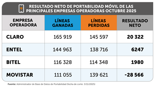 De acuerdo a la información proporcionada por el Administrador de Base de Datos de Portabilidad (ABDP) al OSIPTEL, Claro tuvo el mayor número de portaciones netas positivas (más líneas ganadas que perdidas) con 20 322 líneas, seguida de Entel (6247) y Bitel (1980). Por su parte, Movistar obtuvo un saldo neto negativo de 28 566 líneas, que refleja desafíos para su estrategia comercial en los próximos meses.