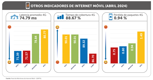 El indicador de latencia, que analiza si un contenido en línea se accede con mayor o menor retardo, obtuvo un promedio nacional de 74.79 ms (milisegundos), mientras que el tiempo de cobertura, que permite conocer el porcentaje promedio de tiempo en el cual estamos dentro de la cobertura de la tecnología 4G, lo que significaría el acceso a una mejor experiencia en navegación de diversos contenidos en ese periodo, promedió 88.67 %.