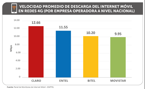 De acuerdo a la información procesada por el Panel de Monitoreo de Internet Móvil del Organismo Supervisor de Inversión Pública en Telecomunicaciones (OSIPTEL), la velocidad promedio de descarga de internet móvil en redes 4G en el cuarto mes del año, llegó a los 11.38 Mbps (megabits por segundo) a nivel nacional.