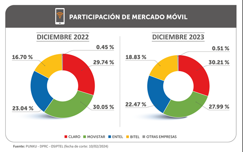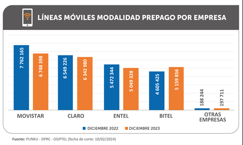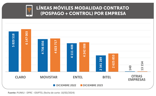 Según la información publicada en el portal Punku (https://punku.osiptel.gob.pe/) del OSIPTEL, este aumento es resultado del avance en la cantidad de líneas móviles de las cuatro principales empresas operadoras. En términos porcentuales, Bitel fue la que reportó un mayor incremento, tras registrar 12.15 % más en número de líneas contrato respecto a diciembre de 2022. En tanto, las líneas de Claro en esta modalidad crecieron en 5.61 %; las de Entel, en 3.18 %; y las de Movistar, en 1.83 % en el mismo periodo.