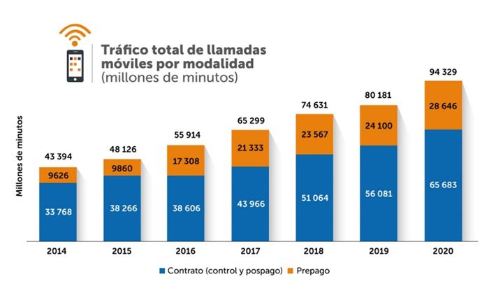 Durante el periodo evaluado, el volumen de llamadas desde una línea móvil con modalidad contrato se elevó 17,1 % al pasar de 56 081 millones de minutos a 65 683 millones de minutos el 2020, con lo que la participación de esta modalidad se consolidó en 69,6 %. Mientras, en el caso de las llamadas desde una línea móvil con modalidad prepago, se registró un aumento de 18,9% al pasar de 24 100 millones de minutos a 28 646 millones de minutos, con lo que su participación fue de 30,4 %.