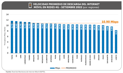 Los resultados del panel determinaron que, en setiembre, la velocidad de descarga promedio se incrementó en todas las regiones, pero solo siete regiones obtuvieron resultados por encima del promedio nacional: Tacna (11.72 Mbps), Ica (11.63 Mbps), Lima (11.49 Mbps), Lambayeque (11.34 Mbps), Tumbes (11.30 Mbps), Arequipa (11.01 Mbps) y Callao (10.96).