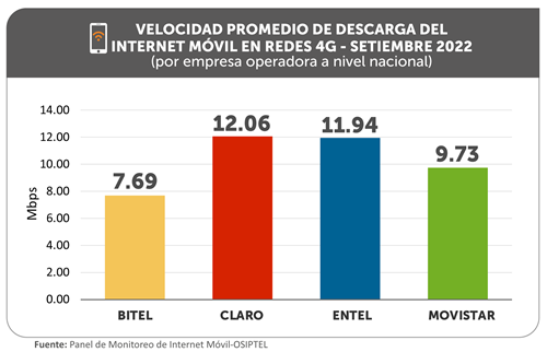 De acuerdo al Panel de Monitoreo de Internet Móvil, la empresa operadora Claro lidera, por cuarto mes consecutivo, la velocidad promedio para redes 4G con 12.06 Mbps, seguida de Entel (11.94 Mbps), Movistar (9.73 Mbps) y Bitel (7.69 Mbps), tal como consta, también en la herramienta virtual Checa tu Internet Móvil del OSIPTEL.