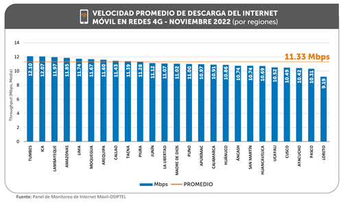 La mejora en la velocidad de descarga promedio se vio reflejada en 21 regiones cuyas cifras crecieron en noviembre, sin embargo, solo nueve obtuvieron resultados por encima del promedio nacional: Tumbes (12.1 Mbps), Ica (12.07 Mbps), Lambayeque (11.97 Mbps), Amazonas (11.85 Mbps), Lima (11.74 Mbps), Moquegua (11.67 Mbps), Arequipa (11.6 Mbps), Callao (11.43 Mbps) y Tacna (11.39 Mbps).