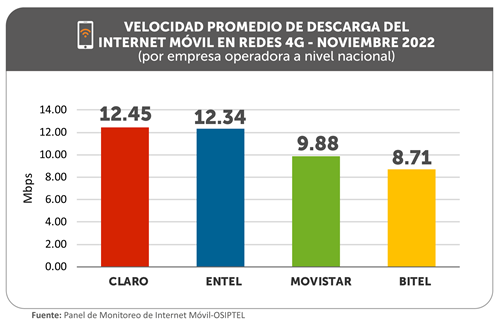 De acuerdo al Panel de Monitoreo de Internet Móvil, la velocidad promedio de descarga de noviembre fue la más alta en lo que va de 2022 y se debió a que todas las empresas operadoras mejoraron sus registros respecto a octubre: Bitel (+0.23 Mbps), Entel (+0.23 Mbps), Claro (+0.22 Mbps) y Movistar (+0.07 Mbps). Se trata del cuarto mes consecutivo en que se evidencia una mejora en la velocidad promedio de descarga del internet móvil.