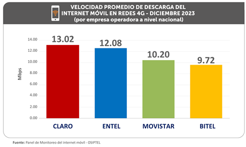 De acuerdo con la información recopilada por el Panel de Monitoreo del Internet Móvil del OSIPTEL, al cierre del 2023, todas las empresas operadoras incrementaron su promedio en el indicador velocidad de descarga (bajada) respecto al año previo. La empresa operadora Claro ofreció el internet móvil más veloz en el 2023, con 12.9 Mbps, seguida de Entel (12.00 Mbps), Movistar (10.06 Mbps) y Bitel (9.25 Mbps).