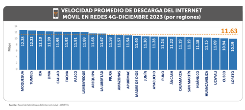 En diciembre de 2023, 22 regiones del país mejoraron sus promedios de velocidad de descarga, respecto al mes anterior, pero solo 10 de ellas tuvieron promedios por encima de la media mensual (11.63 Mbps). Así, los mejores promedios de velocidad de descarga estuvieron en Moquegua (12.28 Mbps), Tumbes (12.22 Mbps) e Ica (12.10 Mbps).