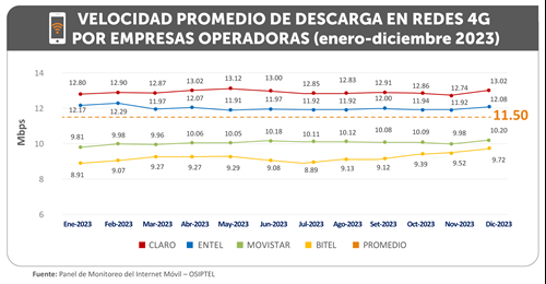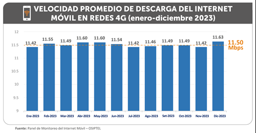 La velocidad promedio de descarga para redes móviles 4G a nivel nacional llegó a 11.50 Mbps (megabits por segundo) durante el 2023, superando el promedio registrado el año previo (10.45 Mbps), informó el Organismo Supervisor de la Inversión Privada en Telecomunicaciones (OSIPTEL).