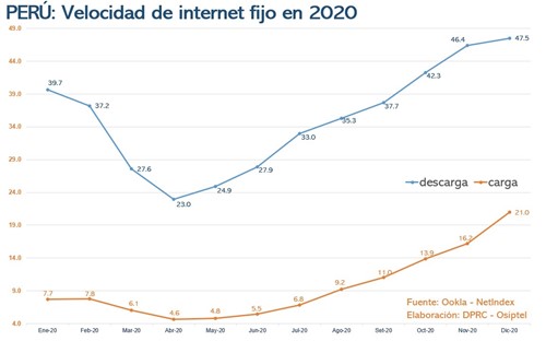 De acuerdo al último reporte de la empresa Ookla (referente mundial en mediciones de rendimiento de las conexiones de internet), en diciembre de 2020 la velocidad de internet fijo en el Perú cerró con 47.5 Mbps, lo que representa un incremento de 19.6% en comparación a la velocidad registrada en enero de dicho año (39.7 Mbps), informó el Organismo Supervisor de Inversión Privada en Telecomunicaciones (OSIPTEL).