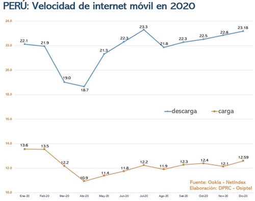 Según el reporte de Ookla, la velocidad de descarga de internet móvil en Perú cerró diciembre 2020 en 23.18 Mbps, 4.8% más que la velocidad registrada en enero 2020 (22.1 Mbps).