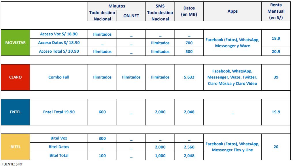 Al respecto, en contraste con la oferta lanzada originalmente en el 2016, los planes de Movistar, Claro y Entel presentan mejores condiciones al contar con mayor cantidad de minutos, mensajes de texto y datos libres o exclusivos para aplicaciones y, asimismo, en algunos casos, un menor nivel de renta mensual. Bitel, en tanto, lanzó una nueva oferta de 3 planes tarifarios con rentas mensuales de S/ 20.