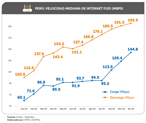 En diciembre de 2024, la velocidad mediana de descarga en Perú fue 195.9 megabits por segundo (Mbps), lo que representa una mejora superior al 90 %, en comparación a enero del mismo año (101.6 Mbps) y el doble del resultado registrado en diciembre de 2023 (94.6 Mbps).
