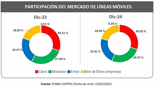 En cuanto a la participación de mercado, Claro se mantiene en el primer lugar con 12.83 millones de líneas móviles, lo que representa el 30.05 % de la cuota de mercado, seguida por Movistar con 11.35 millones de líneas (26.57 %), Entel con 9.66 millones (22.61 %) y Bitel con 8.75 millones (20.49 %).
